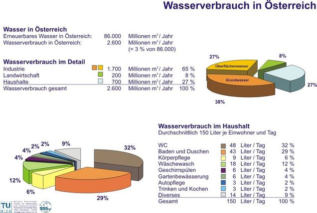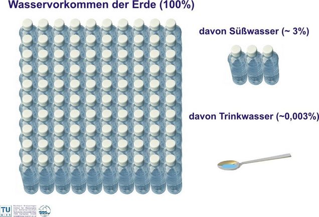 Der Wasserbedarf der Menschen auf unserem Planeten schwankt gewaltig. Während heute 40 % der Weltbevölkerung in Asien und Afrika ernsthafte Wasserprobleme haben (ein großer Teil hat weder Zugang zu sauberem Trinkwasser, noch zu sanitären Einrichtungen), verbrauchen die Bewohner der sogenannten "Wohlstandsländer" pro Kopf rund 150 Liter Wasser täglich.