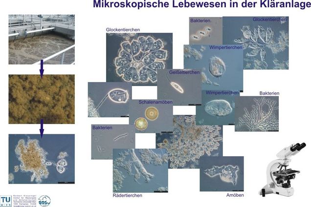 - Im Nachklärbecken sinken die "satten" Mikroorganismen zu Boden. Das gereinigte Wasser wird nun in den Bach oder Fluß abgeleitet.