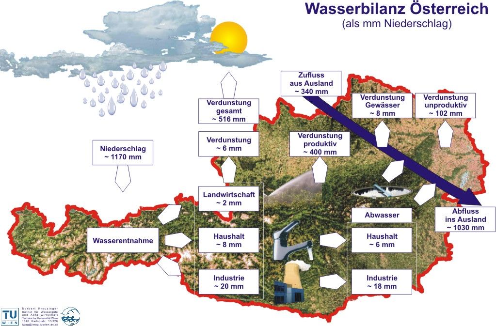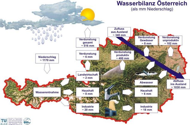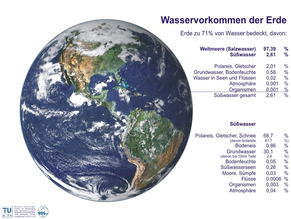 Rund 71 % der Erde sind mit Wasser bedeckt - unser blauer Planet dürfte eigentlich nicht "Erde", sondern müßte "Wasser" heißen. Der überwiegende Teil davon befindet sich in Meeren und Ozeanen und ist salzig. Aber auch der Großteil des Süßwassers - gebunden als Eis an den Polen - ist für den Menschen nicht nutzbar. So bleibt uns nur sehr wenig als Trinkwasser. Wasser bewegt sich in einem Kreislauf. Durch Verdunstung steigt es auf, kühlt in der Atmosphäre ab und sammelt sich in Wolken. Im Allgemeinen dauert es 8 - 10 Tage, bis die Moleküle von dort als Regentropfen zur Erde zurückkehren. Nur 2 - 3 Wochen verbringt ein Tropfen in einem Fluß, jedoch bis zu tausend Jahre in einem See.